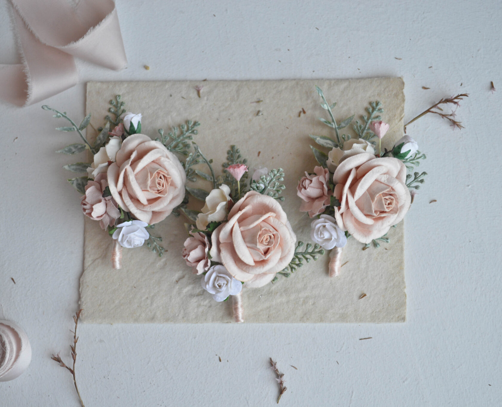 - Boutonnieres and Corsages: Perfect for the wedding party, these accessories are durable, allergy-friendly, and tailored to match your color palette.